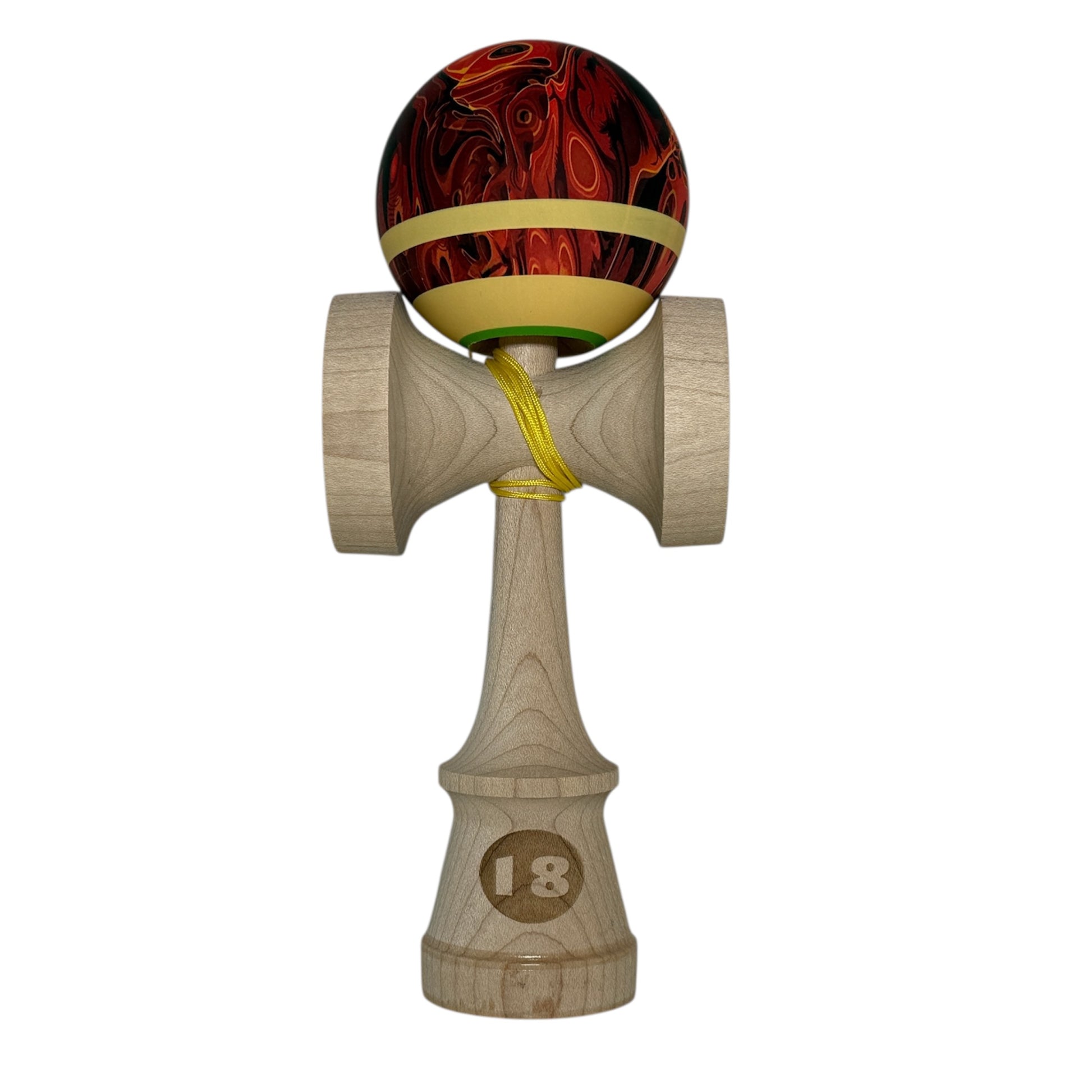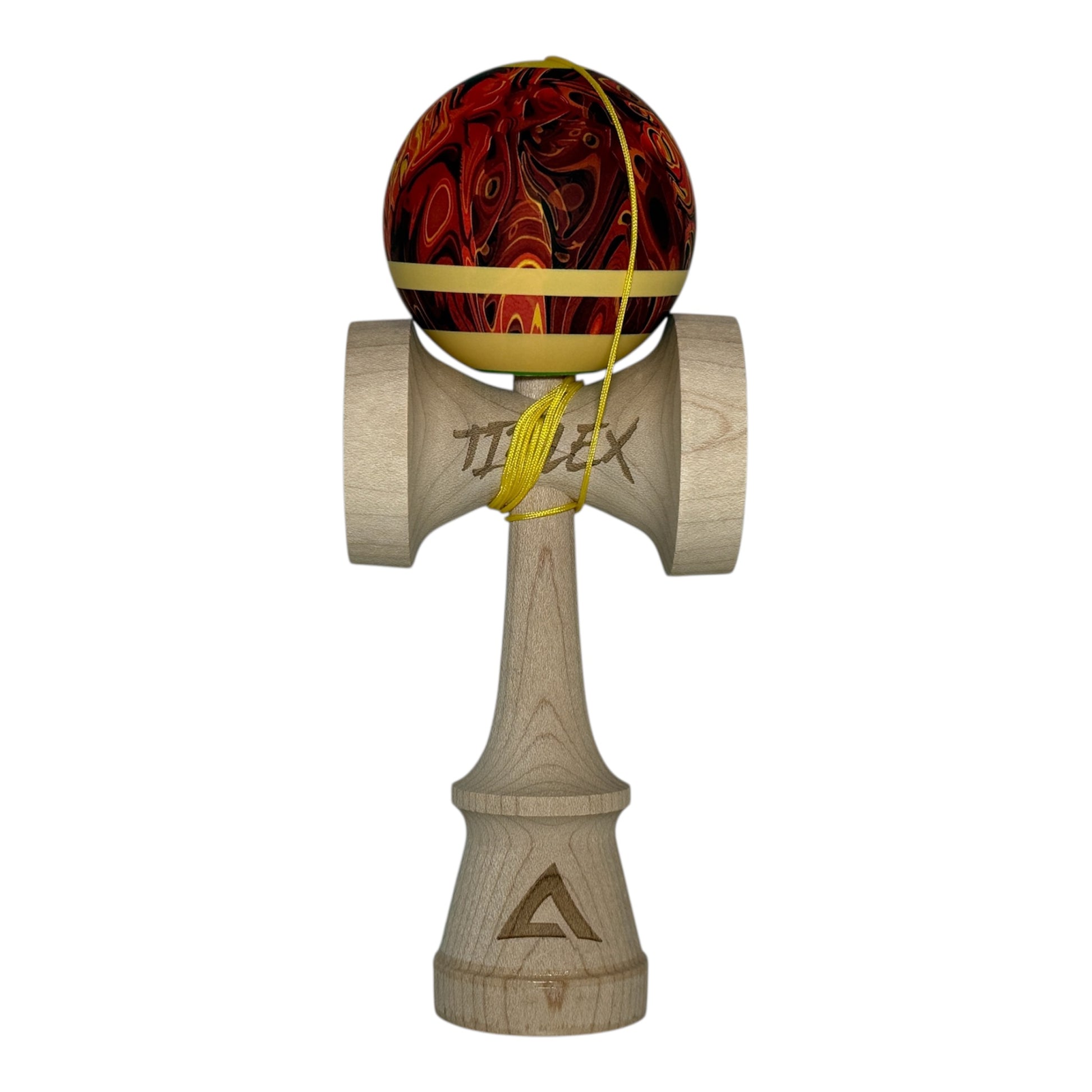 The Tiblex Mod 3.0 draws inspiration from Tiblex’s love of abstract art, blending his favorite colors into a dynamic, eye-catching design. The tama features 70% coverage of red, black, and yellow abstract patterns, accented with cream stripes encircling the bottom, a yellow top dot, and a green ring around the bevel for added tracking and visual focus.